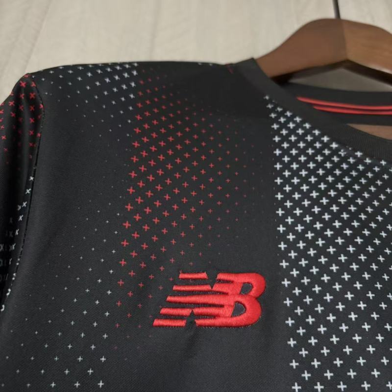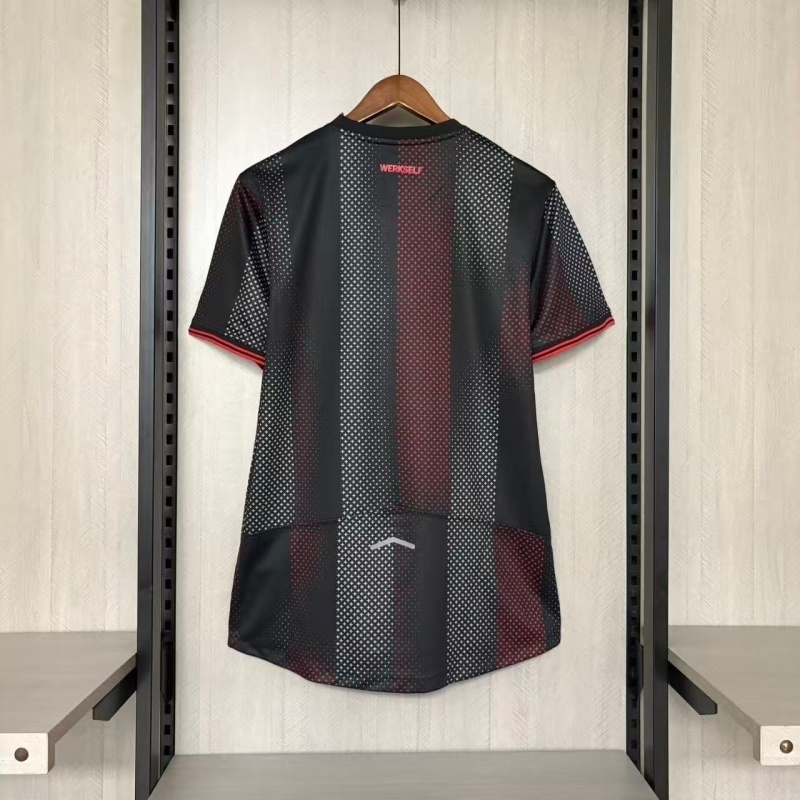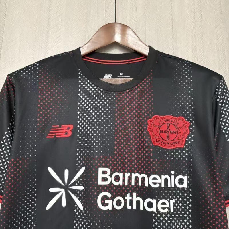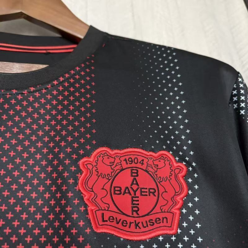 El negro y rojo se combinan con un patrón gráfico moderno que representa la intensidad del juego del Leverkusen. El escudo en rojo monocromático y los detalles en diagonal le dan un toque agresivo y elegante a la vez.