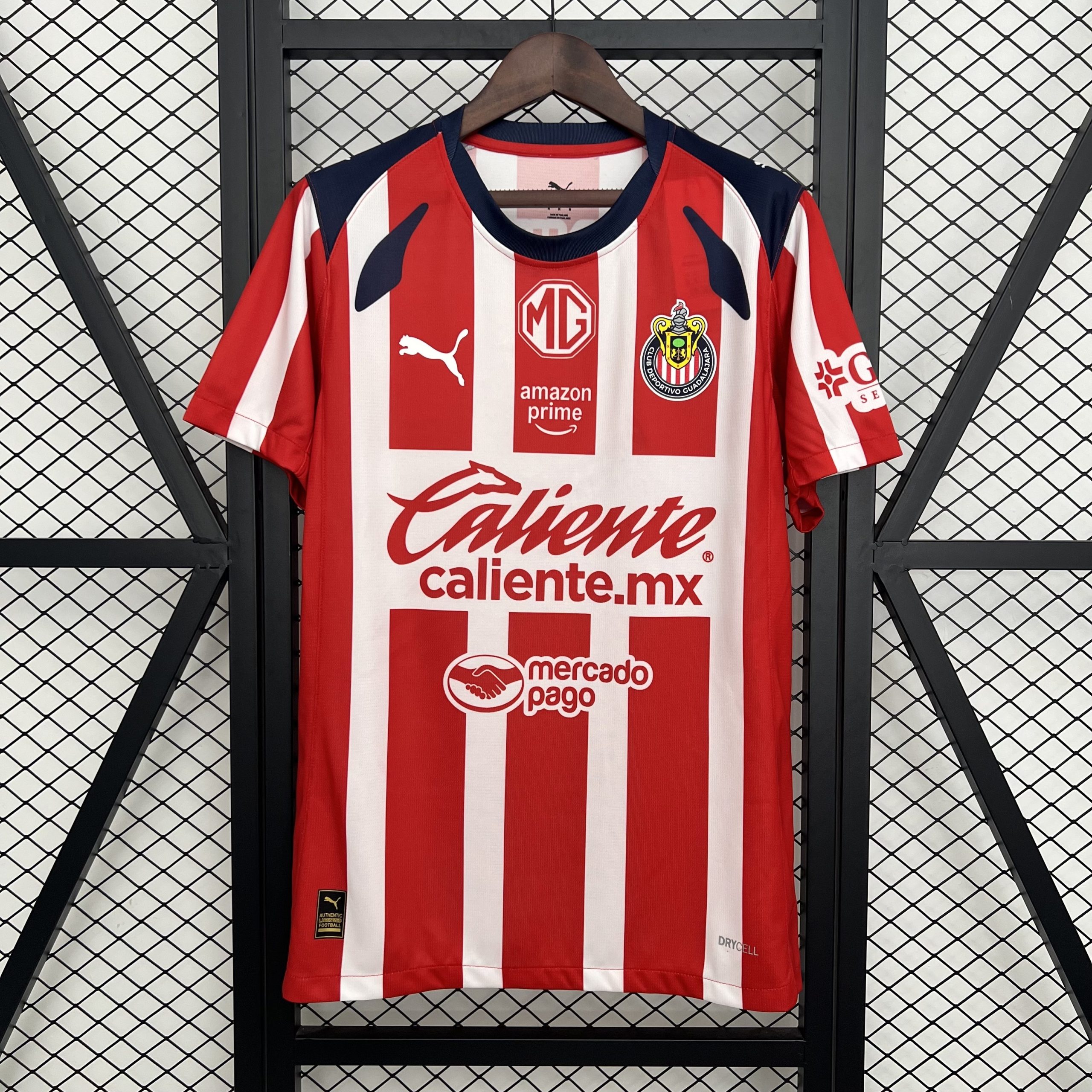 La camiseta local de Chivas 2024 mantiene su clásica identidad con franjas verticales rojas y blancas, pero añade un toque moderno con detalles en azul marino en los hombros y cuello. El diseño es vibrante y dinámico, con múltiples patrocinadores visibles al frente, como Caliente.mx, Mercado Pago, MG, Amazon Prime y Puma. El escudo del club se posiciona en el pecho derecho, resaltando sobre el fondo blanco. El cuello redondo con inserciones en rojo y azul complementa la estética tradicional con una dosis de frescura. Un diseño cargado pero fiel al ADN rojiblanco.
