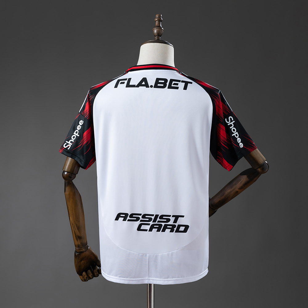 La camiseta de visita del Flamengo 2024 combina el blanco tradicional con detalles modernos en rojo y negro. El diseño destaca por sus mangas negras con un gráfico dinámico en rojo, simulando pinceladas que aportan fuerza visual. El escudo del club y el logo de Adidas aparecen en rojo, contrastando con el blanco del torso. El sponsor principal, en negro, completa una estética equilibrada y agresiva. Un diseño audaz que mantiene la identidad del Mengão con un toque contemporáneo.