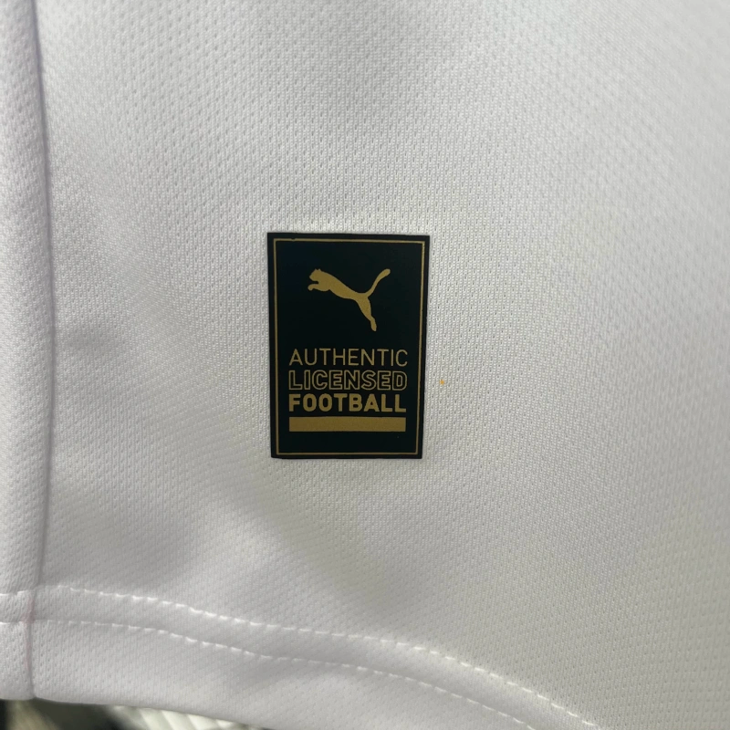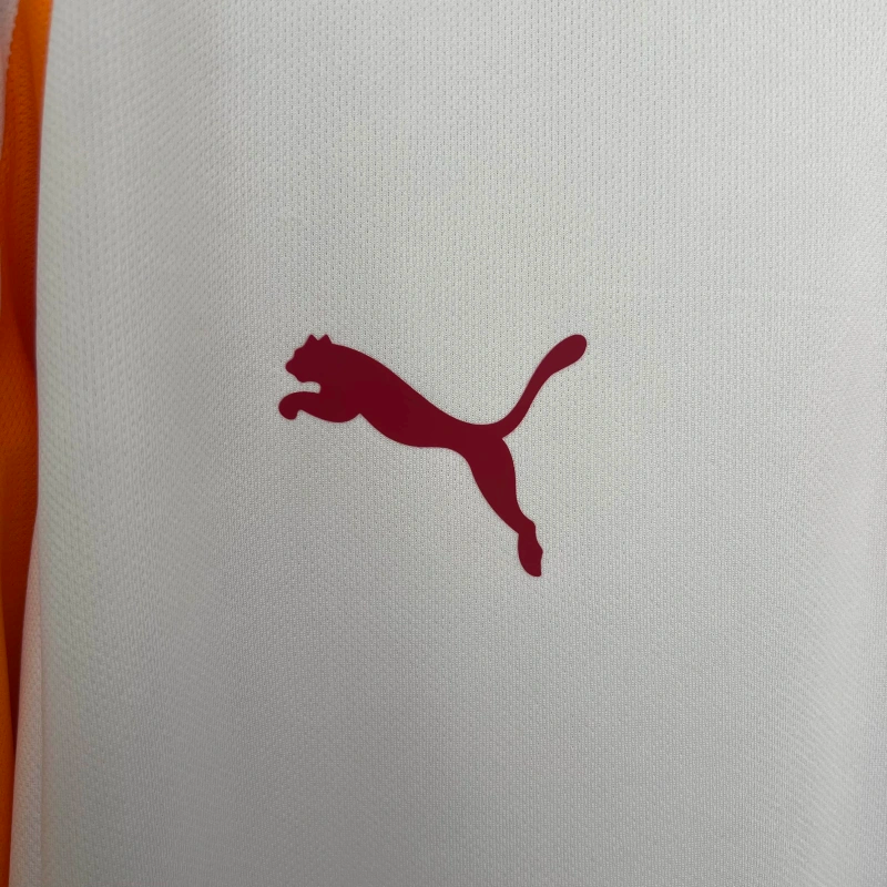 La camiseta de visita del Galatasaray para la temporada 25/26 presenta un diseño elegante y limpio con base blanca. Destacan los detalles en granate en el cuello tipo polo, puños y logos, mientras que paneles naranjas en los costados agregan el tradicional toque del club. Al centro, la bandera turca se sitúa entre el escudo del Galatasaray y el logo de Puma, reafirmando identidad nacional. Un diseño sobrio pero con carácter, ideal para los duelos fuera de casa.