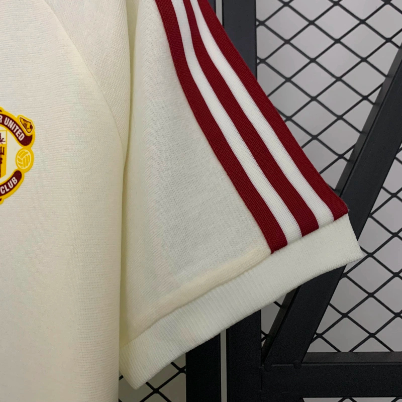 Una camiseta retro con alma de tribuna. Este diseño especial de adidas combina el escudo clásico del United con el logo vintage de la marca, sobre una base crema con detalles en rojo. Inspirada en los años dorados del club, es una pieza pensada para coleccionistas e hinchas con memoria futbolera.