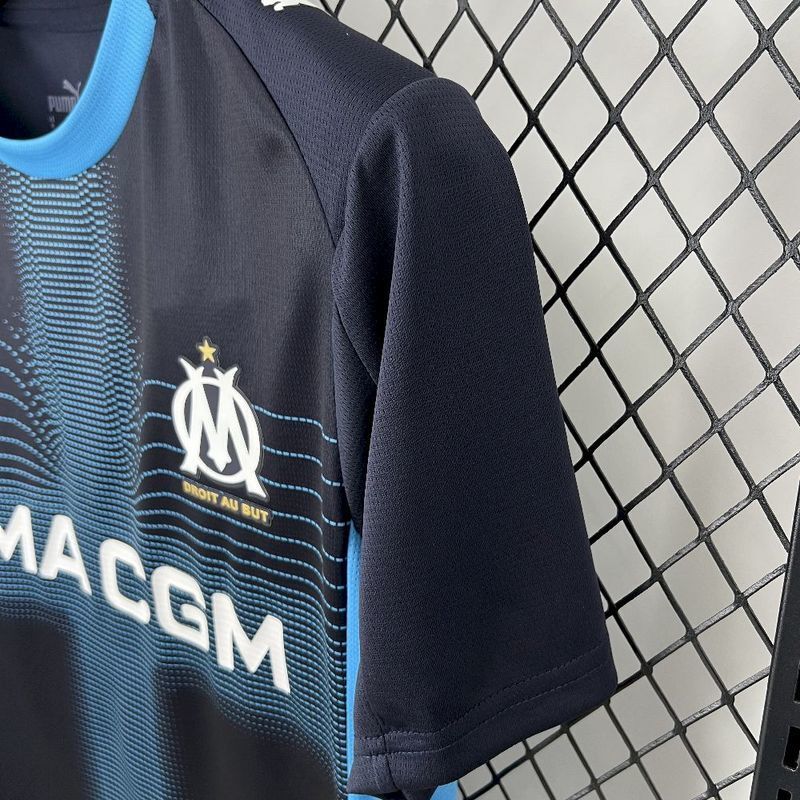 La camiseta de visita del Marsella 25/26 es predominantemente azul marino con detalles celestes en los laterales y cuello redondo. El diseño central presenta un patrón de líneas punteadas en celeste que forman una cruz. El escudo y el logo de Puma van en blanco, al igual que el patrocinador principal. Estilo moderno y sobrio.