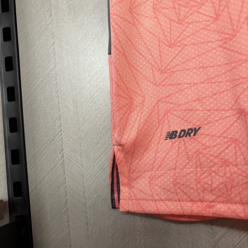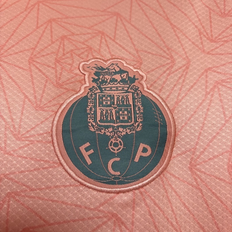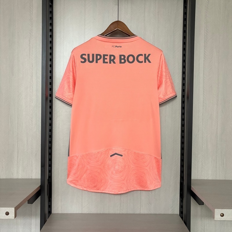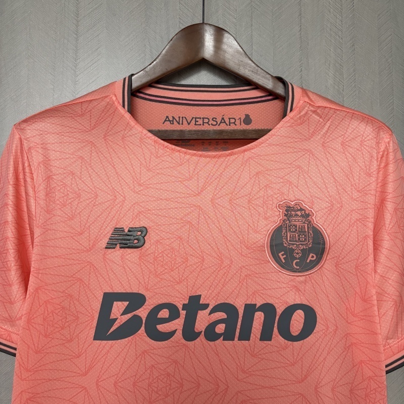 La camiseta de visita del Porto 25/26 destaca con un tono coral vibrante, acompañado por detalles en negro como el escudo, logo de New Balance y patrocinador. El diseño incluye un patrón gráfico sutil en toda la tela, dándole un toque moderno sin perder elegancia.