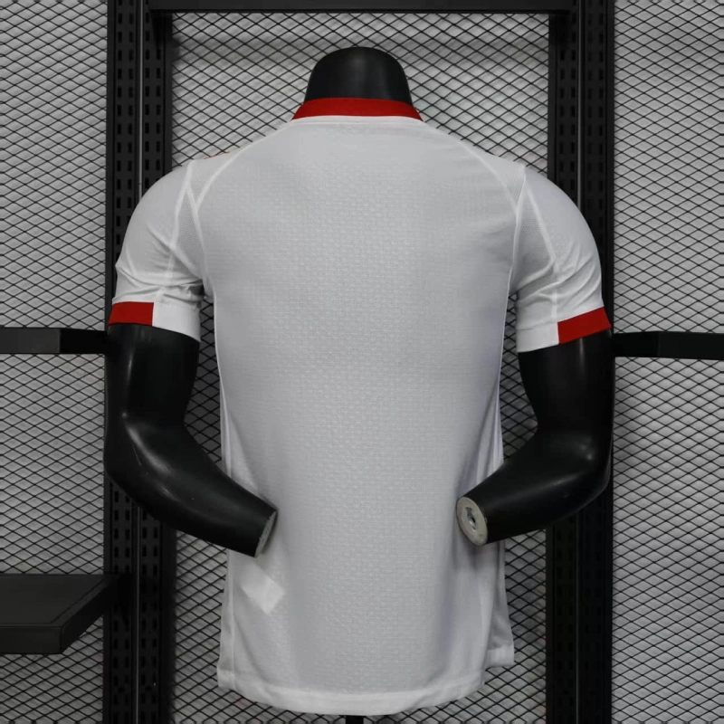 El blanco vuelve a ser protagonista en esta camiseta local, con detalles en rojo y un patrón en forma de flechas que aporta dinamismo al diseño. El logo de Red Bull y el escudo del club resaltan con fuerza en el pecho.