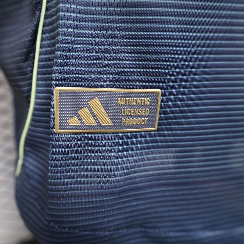 Diseño en azul marino con detalles en blanco y toques en verde lima, que aportan contraste y estilo. El patrón sutil en el tejido le da textura y carácter, ideal para lucir fuera del Bernabéu sin perder la elegancia madridista.