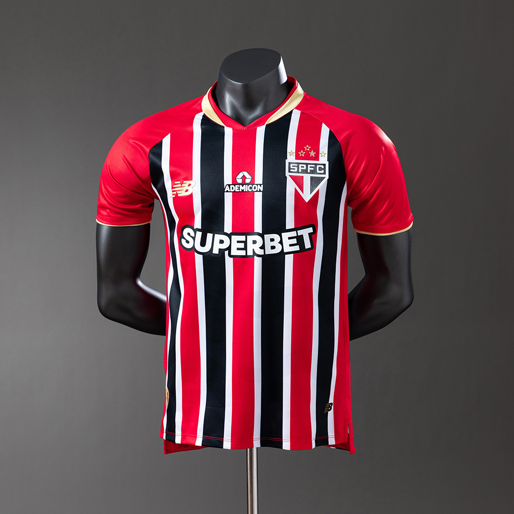 New Balance toma el control del diseño visitante de São Paulo con una camiseta que transpira historia y garra. Las franjas verticales en rojo, negro y blanco no son decoración: son identidad. El escudo al pecho y el dorado en el cuello cierran un look que mezcla legado y ambición. Es una casaca que representa al Tricolor en cualquier cancha como si fuera el Morumbi.
